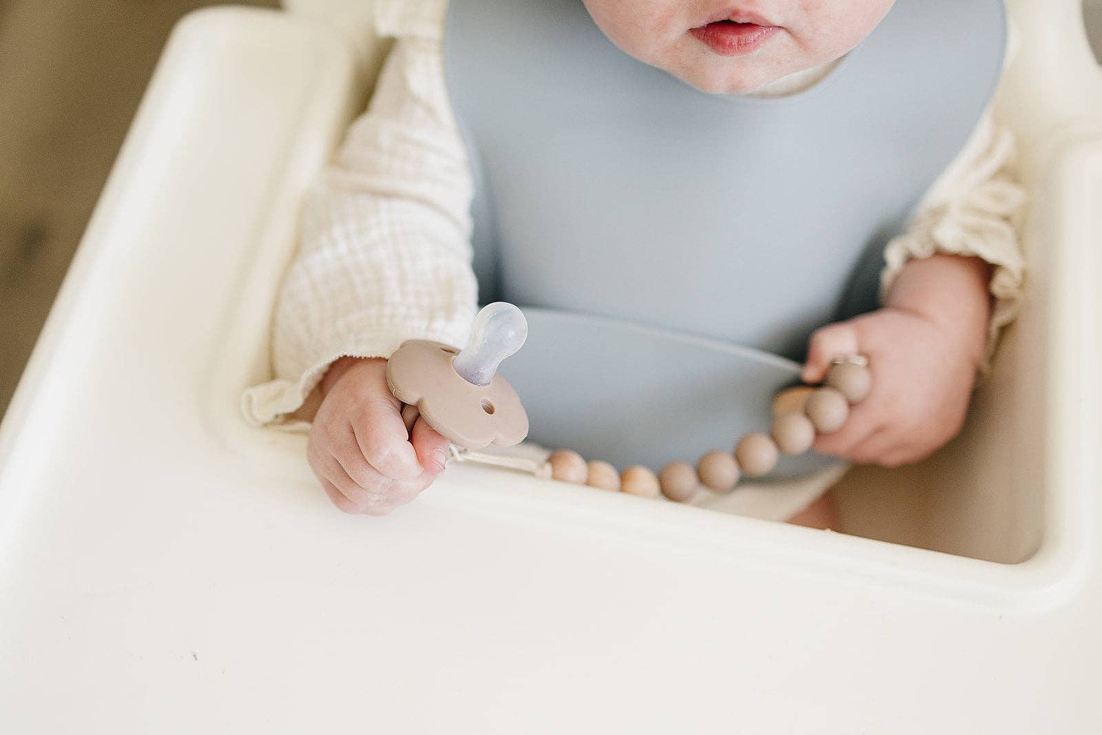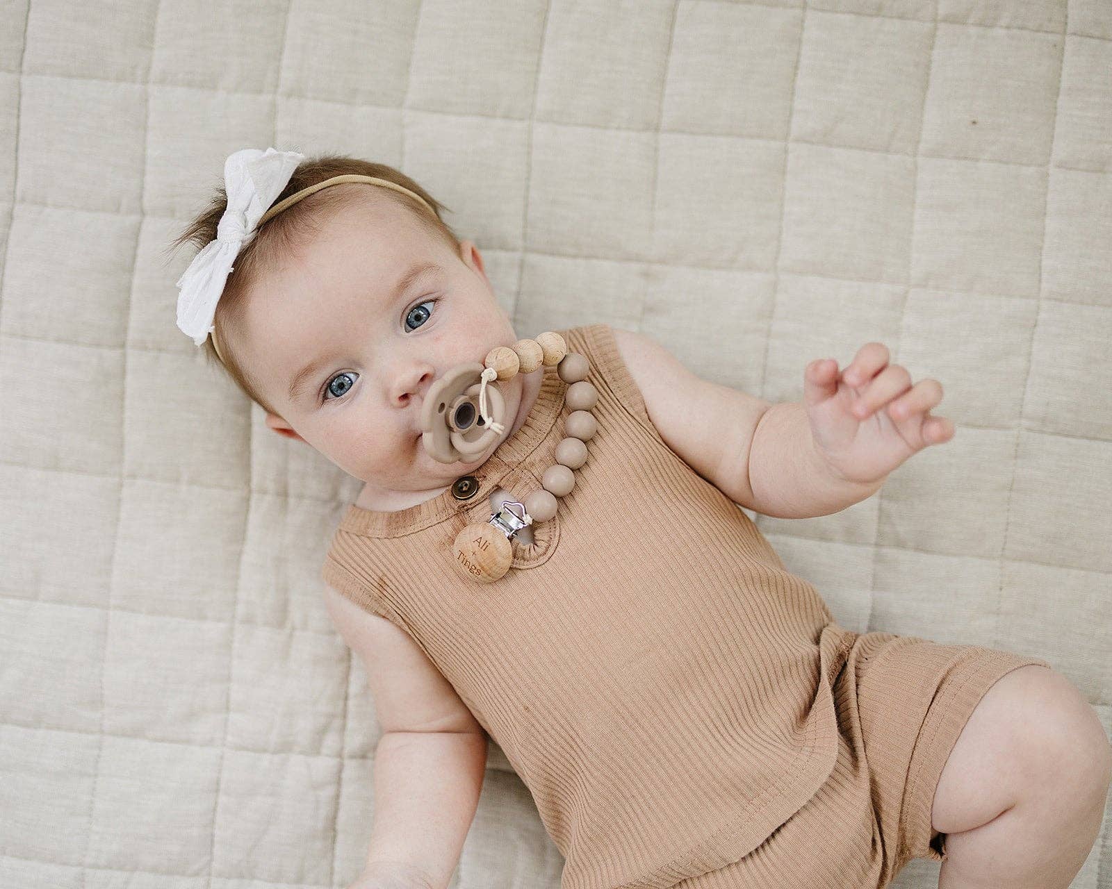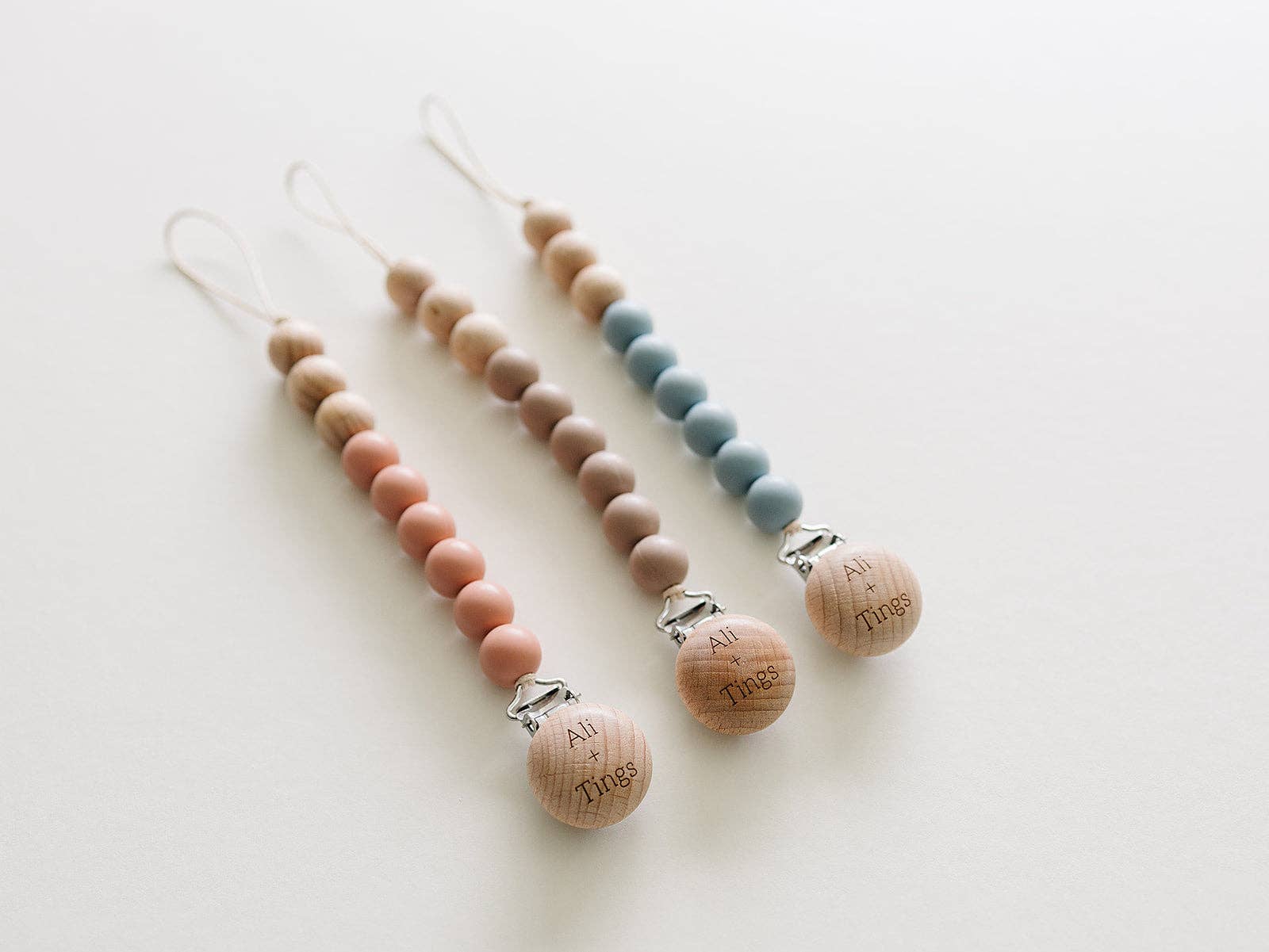 Say goodbye to lost pacifiers with our Ali + Tings silicone pacifier clip! Made of 100% food-grade silicone and beech wood, it's durable and safe for little ones. It’s sold in 3 neutral colors perfect for all babies, it keeps pacifiers, teethers, or toys within reach. Simply attach to clothing or accessories for a clean and hygienic pacifier. No more searching, just happy babies! Recommended for ages 0 months+.
