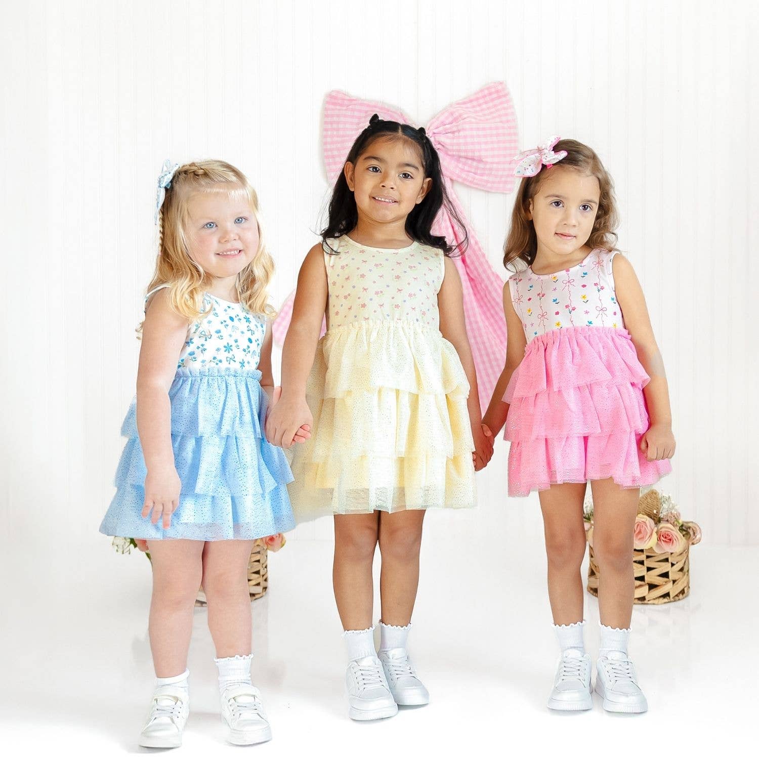 *Color: Pastel yellow cotton bodice with multicolor floral and bow print pattern and a yellow tulle skirt overlay accented with glitter pin dots