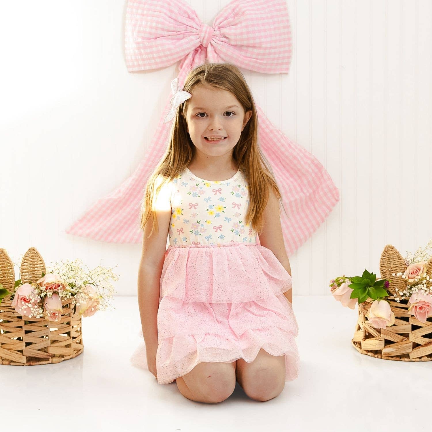 *Color: Ivory cotton bodice with a yellow, blue and pink floral and bow print pattern and a soft pink tulle skirt overlay accented with glitter pin dots