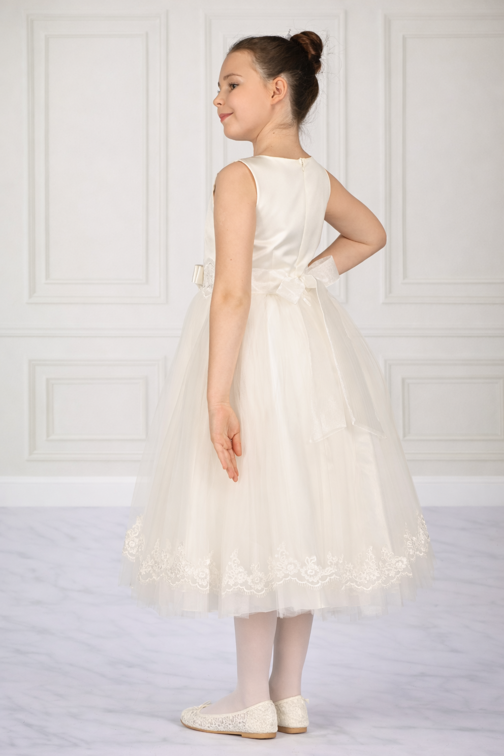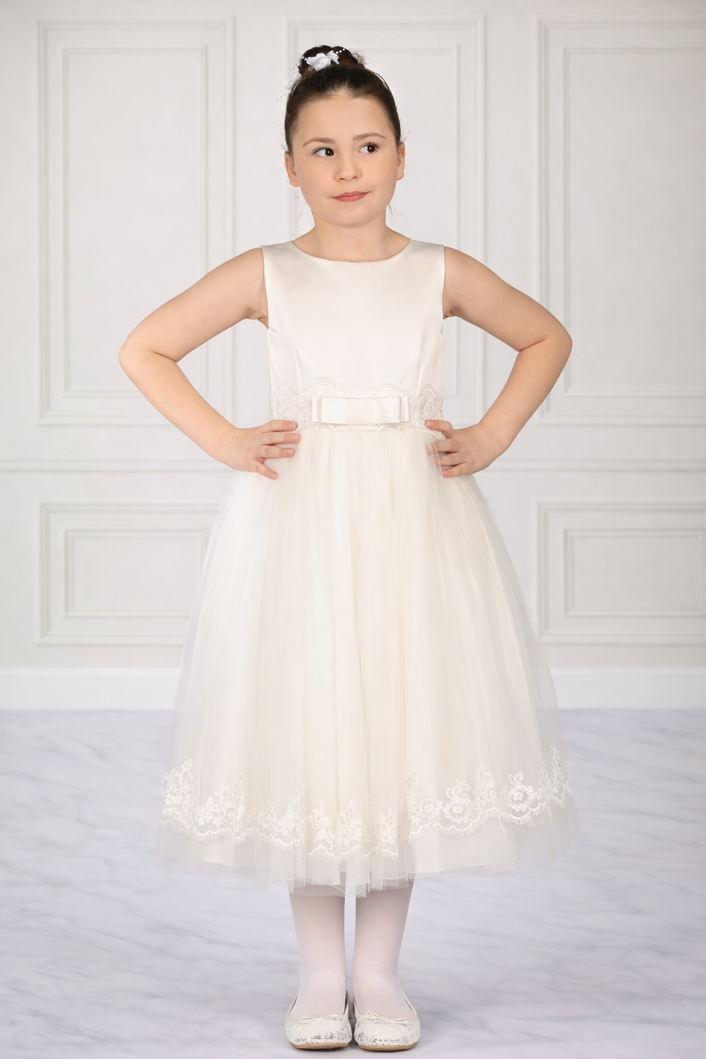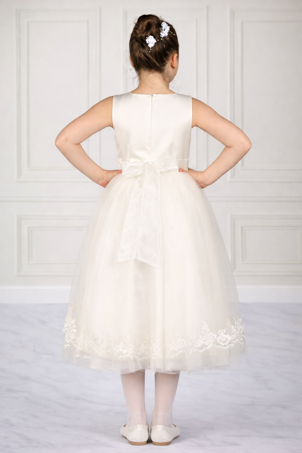 Beautiful hand-crafted dress for girls! Perfect for communion or those special occasions. Made from quality satin, tulle and designed with embroidery lace. Available in white Products delivered in recycled packing and on hangers.