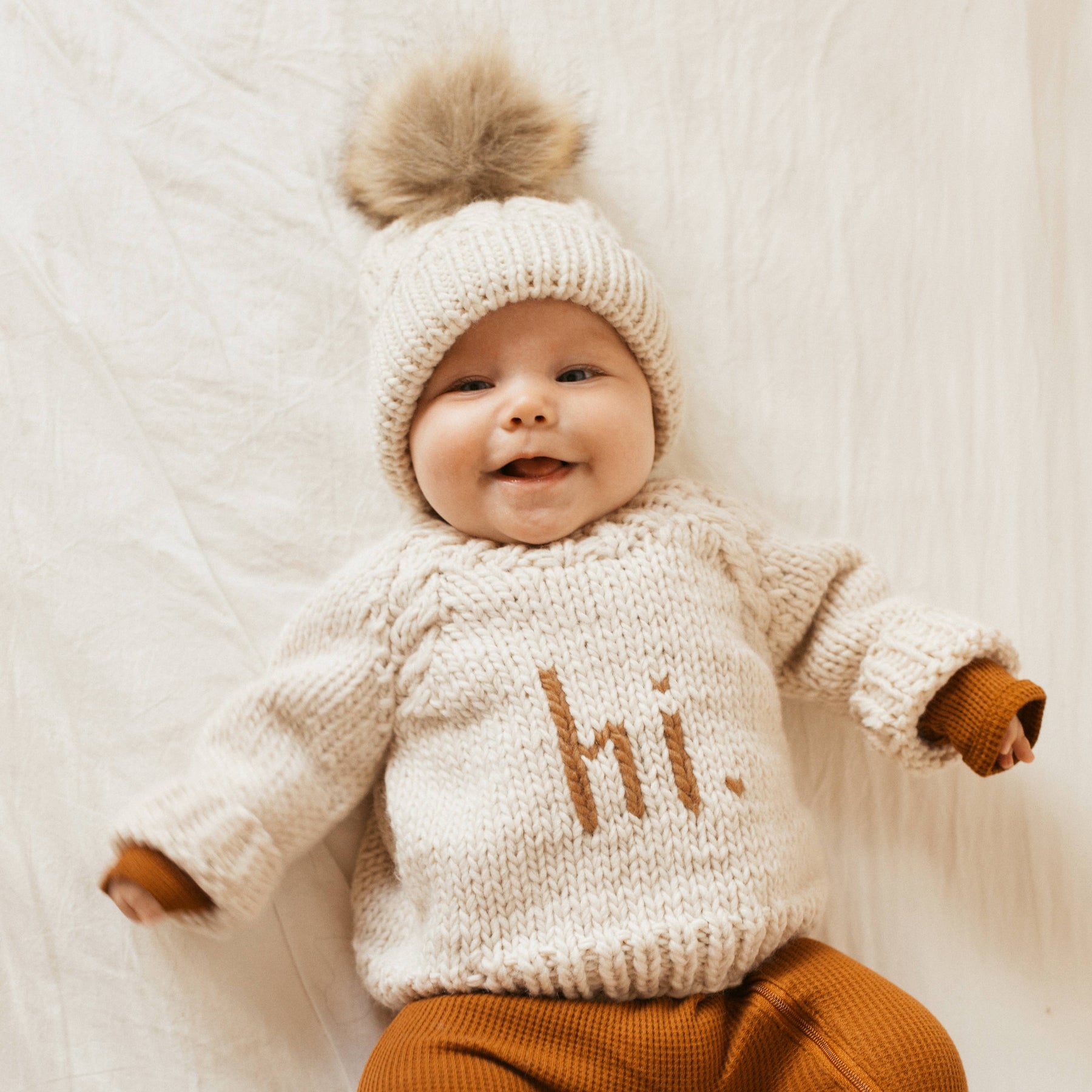 Say hello to cozy comfort with our hi. pullover sweater, crafted from natural-toned yarn. Featuring charming cable-trim raglan sleeves and the word hi. knitted in pecan brown on the front, this sweater is as playful as it is warm. The soft, stretchy neck makes dressing little ones a breeze. Hand-knit with chunky yarn, it’s a snug, gender-neutral choice for any little adventurer. Our sweaters are partially knit from recycled, sustainable Polyester yarn made from plastic bottles. We are on a mission to help reduce the world's plastic pollution problem ♻ • Hand Knit • 60% Acrylic, 40% Recycled Polyester • Hand Wash • Designed in our Coachella Valley, CA studio